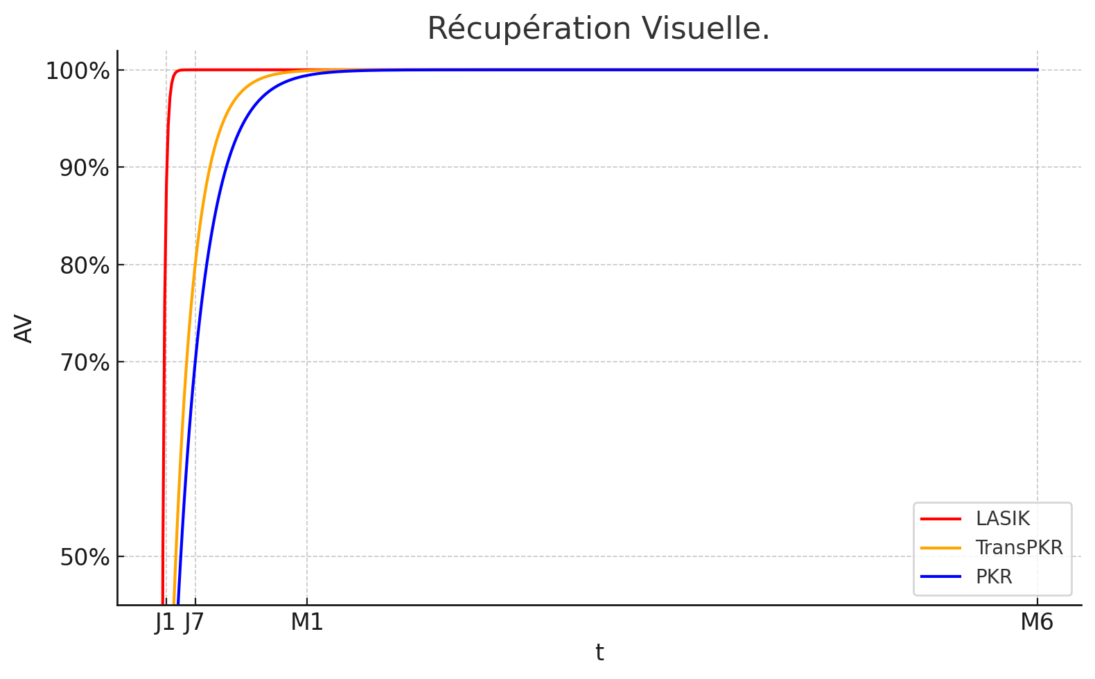 - PKR (bleu) : la récupération est plus lente mais tout aussi efficace. L’amélioration se poursuit sur plusieurs semaines, avec une vision optimale généralement vers le premier mois (M1) à six mois (M6).